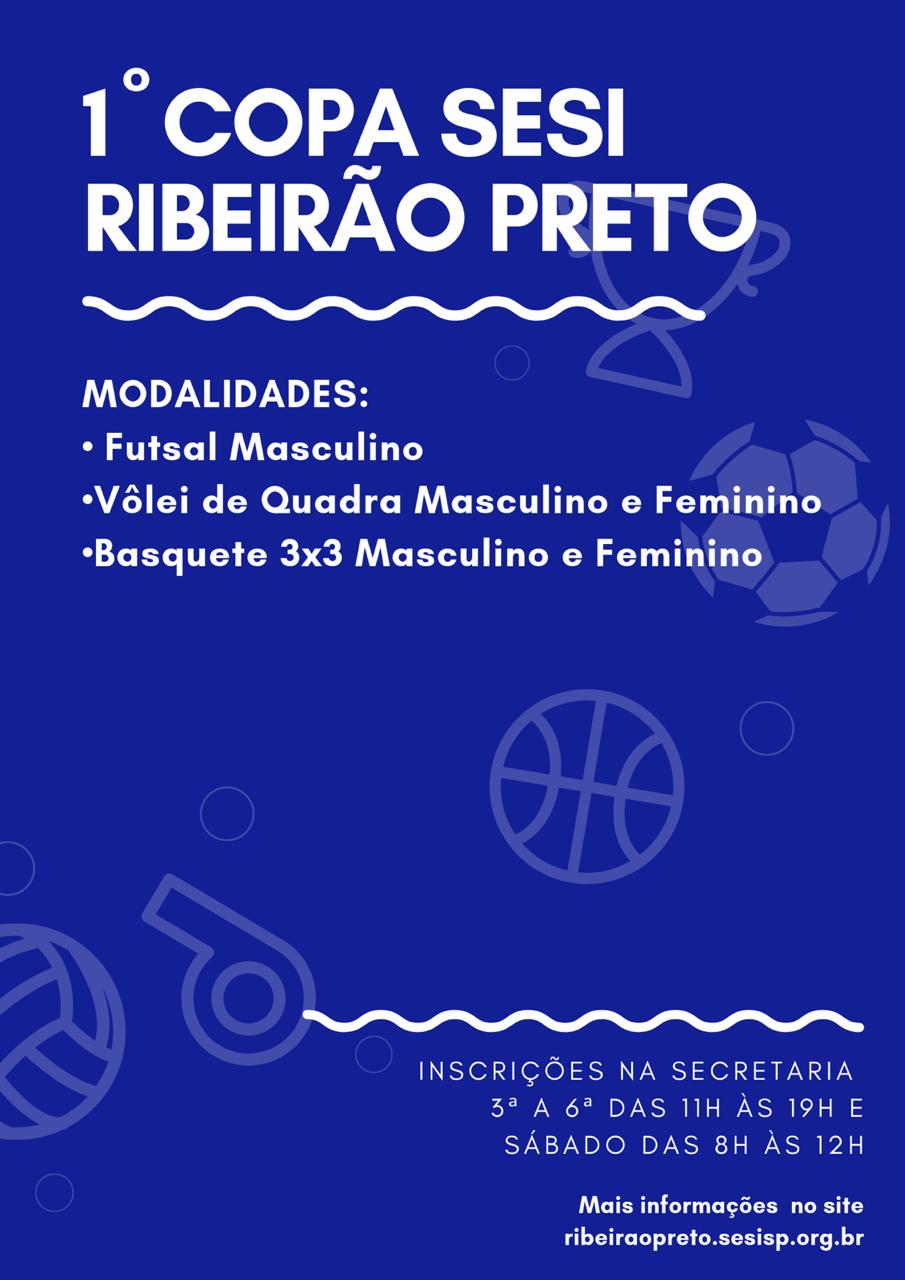 Vem aí a 1ª COPA SESI RIBEIRÃO PRETO, com as modalidades Futsal Masculino, Vôlei de Quadra Masculino e Feminino e Basquete 3x3 Masculino e Feminino.